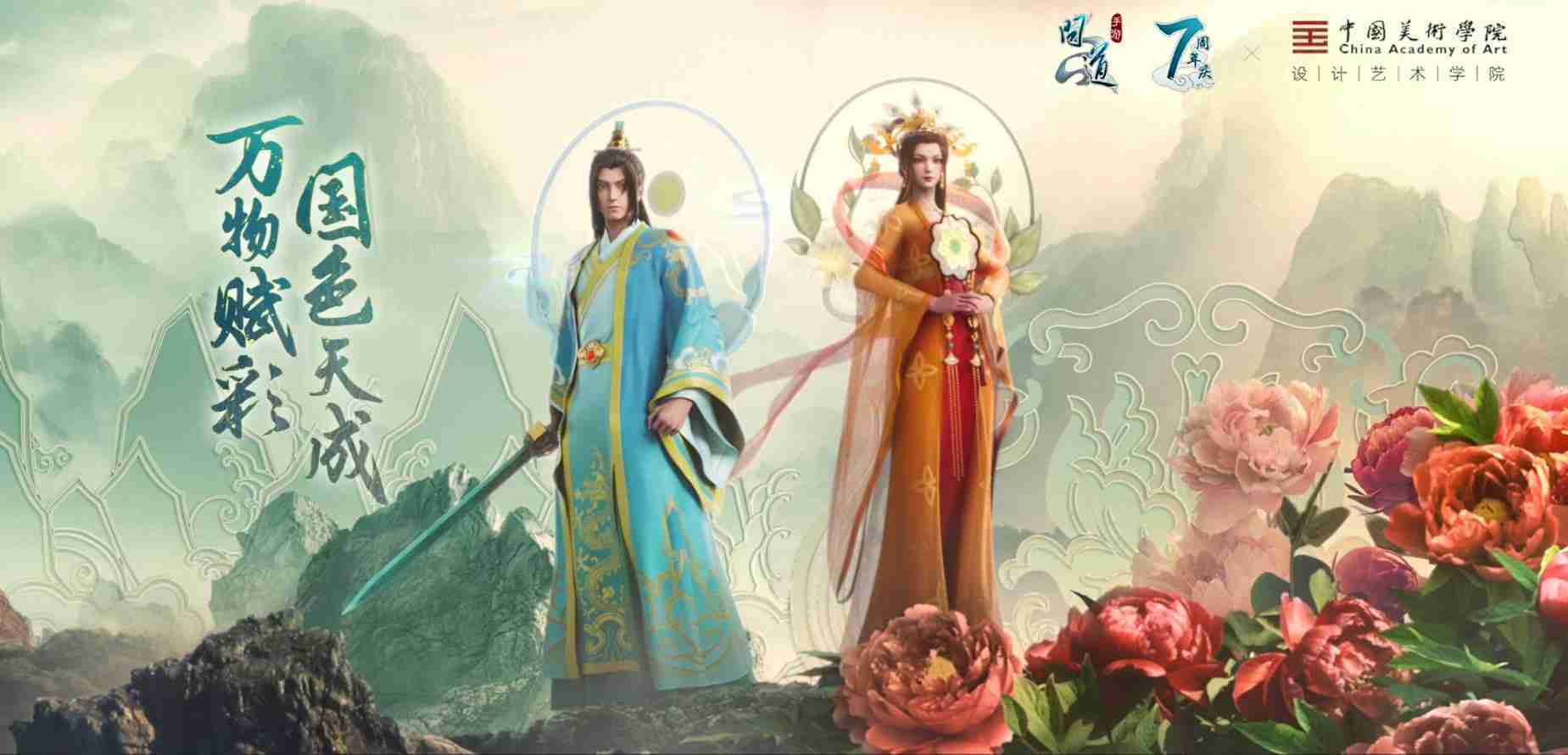 2023年4月,,《问道手游》联动中国美术学院,,,,在游戏中融合了中国历史上不同时期的文化元素,,,打造了“山河万象”与“凤鸣九霄”的国风时装。。。在色彩配置方面,,,,创作团队基于对游戏角色特性的分析提取相应的文化内涵,,,从每一种色彩的色相、、、指代事物和情感出发对应角色属性,,选定服装的色彩搭配。。。在纹样设计方面,,,,创作团队结合游戏角色自身特殊的造型比例和形态,,在实际的纹样设计中进行了游戏语境下的活化演绎。。。。男性角色集中使用了如蟒纹、、海水江崖纹、、、、如意纹和云气纹等传统纹样元素,,,,女性角色则吸纳了凤凰纹、、、牡丹纹、、卷草缠枝纹等元素,,组成以“双凤牡丹纹样”“缠枝牡丹纹”“金玉凤冠头饰”为主要纹样的游戏角色装饰图案系统。。。