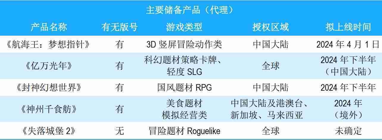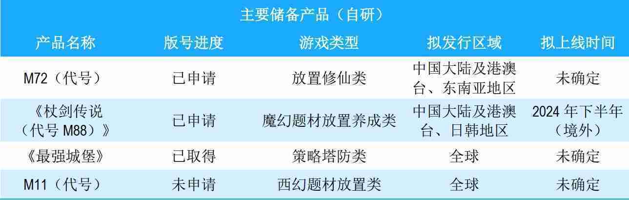公司储备的多个自研、、、、代理产品都在有序推进当中,,,涵盖放置类、、策略类、、模拟经营类、、、、RPG、、、、Roguelike等多元化游戏品类,,储备的主要自研和代理产品如下::::