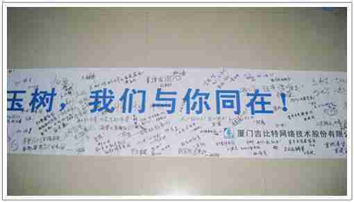 在募捐现场,,,J9.COM同学们怀着沉重的心情,,,,将每一笔捐款投入募捐箱,,,,并在现场设置的横幅上,,,,写上了对玉树人民的深情祝福。。满载J9.COM祝福的横幅将和捐款一起抵达玉树,,,,希望谨以此微薄之意,,为玉树人民带去J9.COM的爱心与祝福,,,希望吉祥、、、幸福的阳光能早日驱散灾难的阴霾,,,,普照在玉树人民的身上,,,鼓励他们坚强、、、勇敢与乐观。。。
