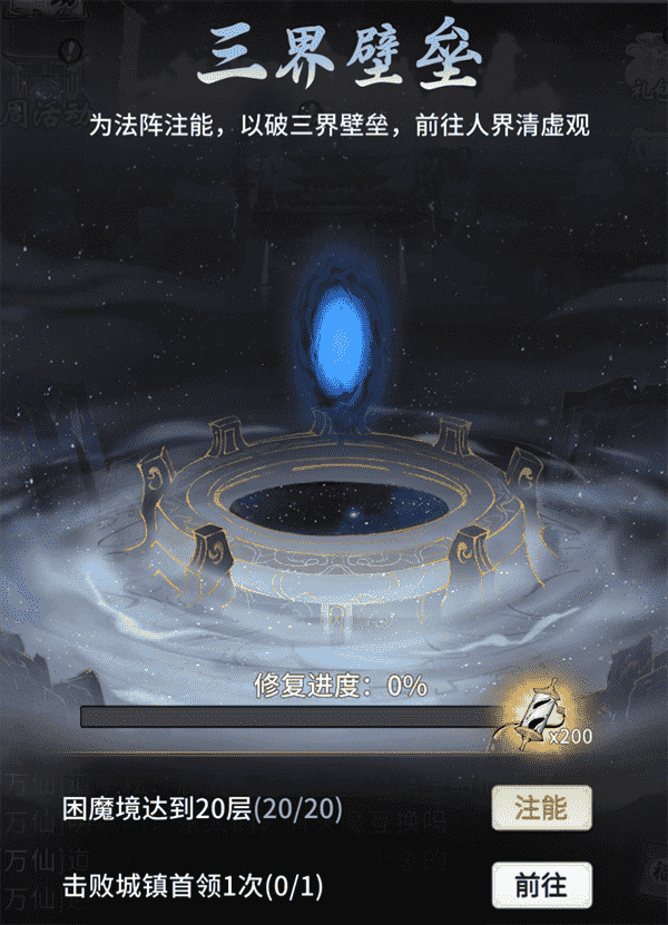 当你修为达到返虚/破虚中期后,,可在城镇寻得芸丫并激活神秘法阵,,,,通过收集材料、、击败首领等方式为法阵注能,,,,借以打破三界壁垒,,开启支线剧情“清虚旧梦”