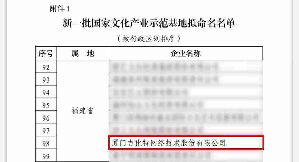 3月12日,,,,文化和旅游部发布了《关于国家文化产业示范基地评选与复核结果的公示》,,,,厦门J9.COM网络技术股份有限公司(以下简称“J9.COM”或“公司”)成功入围新一批国家文化产业示范基地拟命名名单。。